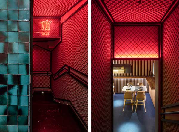 De este modo se logran dos bares y ofertas distintas y con personalidad propia, explican los interioristas. La escalera de conexión entre ambos se convierte en uno de los protagonistas principales del local: es un túnel teñido de luz roja que atrae a clientes hacia una experiencia más nocturna y tal vez prohibida… ¿Lo mejor? Ir a San Sebastián, a conocerlo.
