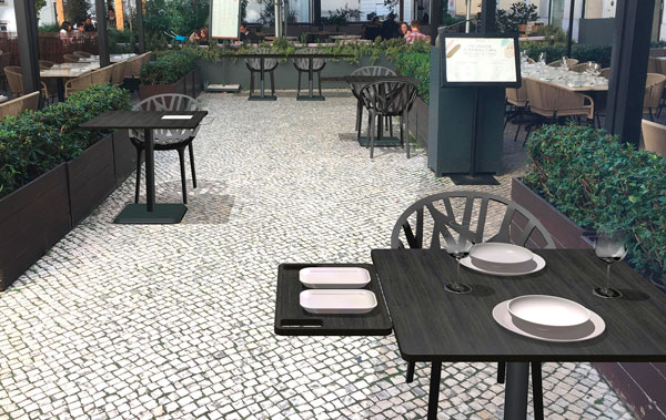 La bandeja Isla se ubica y sujeta con una suave extracción de la estructura tubular bajo la mesa. Además de servir las mesas respetando las distancias de seguridad, logra disponer de más espacio en la mesa cuando los comensales lo requieren y también en los casos que los clientes prefieran el autoservicio.