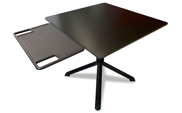 La bandeja Isla aporta un espacio de cortesía de una forma rápida y fácil, ya que se adapta a cualquier mesa de 4 patas o pie central que disponga de un tablero plano (sin estructura perimetral). Por supuesto, es compatible con todos los modelos de mesas esTablees, que se caracterizan porque son siempre estables y jamás cojean, independientemente del estado del pavimento.