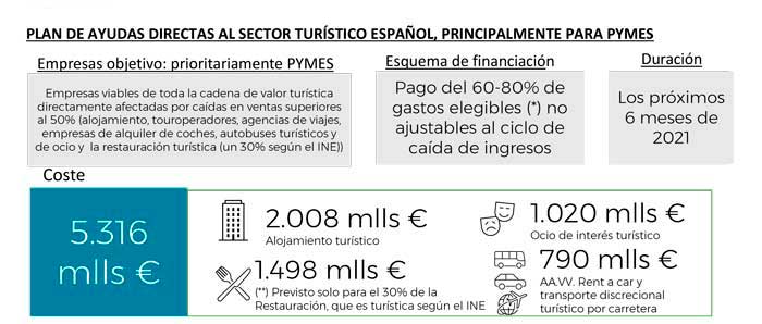 Los empresarios turísticos proponen un plan de rescate económico con ayudas directas institucionales de 5.316 millones de euros a fondo perdido y durante 6 meses a empresas turísticas, principalmente para pymes, basado en la cobertura de gastos operativos no ajustables a la caída de ingresos, para poder garantizar su supervivencia, ante la casi nula actividad prevista para el primer semestre de 2021.