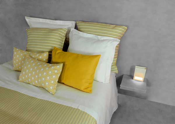 Amarillos y grises en textiles de Resuinsa y Carmela Martí para dar alegría y frescura a la habitación