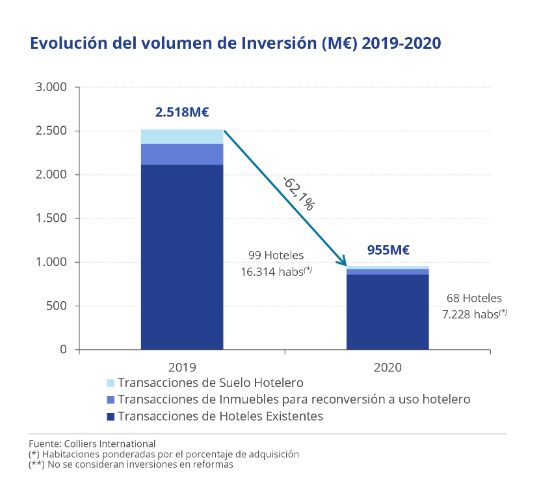 La inversión hotelera en España alcanzó los 955 millones de euros en 2020 (considerando hoteles en funcionamiento, inmuebles para reconversión en hotel y suelo para uso hotelero), según el último Informe de Inversión Hotelera presentado por Colliers International.