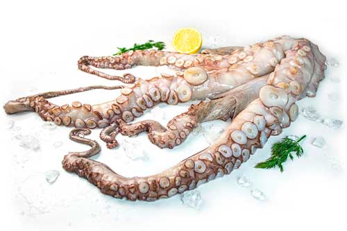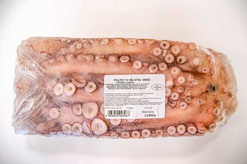 El pulpo se presenta crudo, higienizado y etiquetado, listo para cocinar.