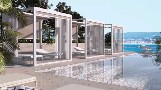 • Brez, concebida por Bandada Studio, es puro diseño y arquitectura de vanguardia. Totalmente customizable, se trata de unas estructuras modulares en aluminio con diferentes acabados, colores, dimensiones, iluminación y muchos otros complementos que podrán elegirse a demanda. Permite crear espacios separados en jardines, piscinas, salas de reuniones, cafeterías, etc.