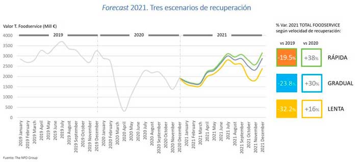 “No obstante, empezamos a ver la luz al final del túnel”, señala Edurne Uranga, directora de Foodservice de NPD en España. “La llegada de las vacunas y el levantamiento progresivo de las restricciones comienzan a dar un poco de aire al consumo fuera del hogar y permitirán que se vaya recuperando progresivamente a lo largo del año”.