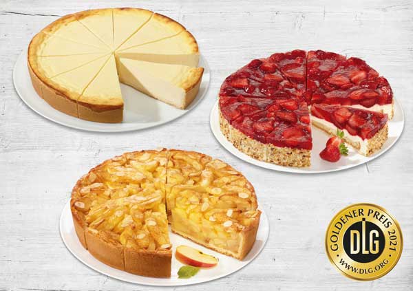 Tarta de Queso y Nata Premium. Tarta de manzana Premium y Tarta Deliciosa de Fresas, tres creaciones de Erlenbacher premiadas por la DLG con medalla de oro