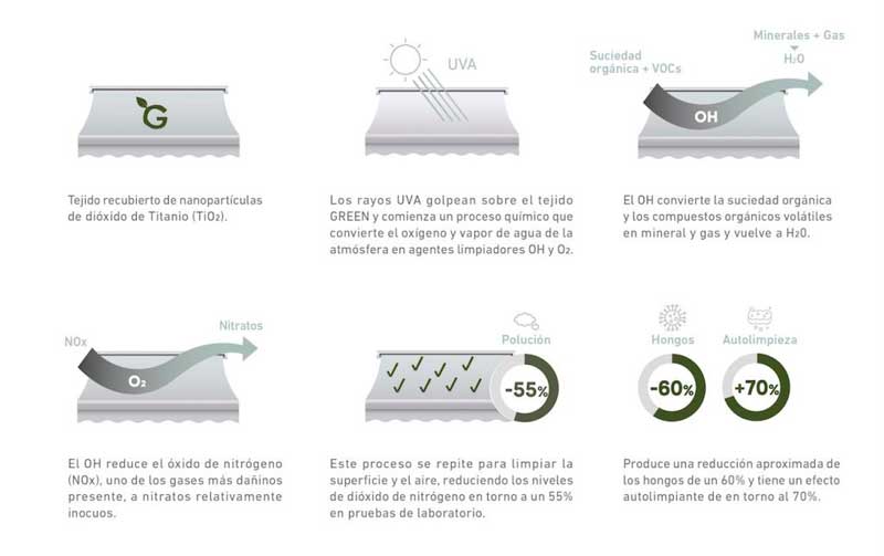 Estes tejido reacciona a la incidencia de los rayos UVA promoviendo un proceso químico que purifica y oxigena el aire, absorbiendo dióxido de carbono y transformándolo en oxígeno.