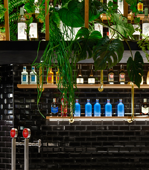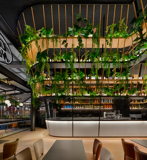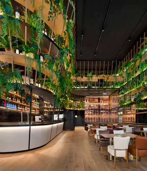 En el interior, el elemento principal es la espectacular barra de madera lacada en negro que recorre todo el local; las curvas controladas ayudan a transformar el espacio en algo más orgánico y natural. «Queremos ofrecer una experiencia inmersiva que genere al usuario la sensación de encontrarse en medio de un bosque selvático, a través de la instalación de plantas que recorren toda la estructura», explican los interioristas.