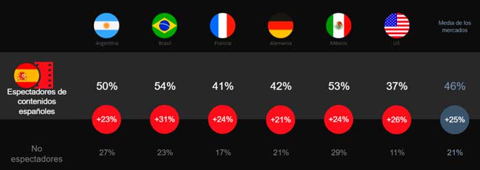 • Permite a una audiencia global acceder a contenidos en español. Las series, películas y documentales españoles son populares en todo el mundo. De media, el 70 % de los espectadores en los países encuestados disfrutan de contenidos hechos en España (destacando especialmente países como Argentina, México o Brasil). En todos los mercados estudiados, el porcentaje de espectadores de contenidos españoles es significativamente mayor entre los usuarios de Netflix frente a los que vieron contenido español en otro sitio.