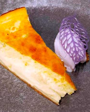 En su tarta ganadora emplean una mezcla de quesos donde el queso de cabra de la Vega de San Martín (Madrid Calidad. Producto Certificado) es el protagonista junto al queso azul de cabra Harbourne Blue. Lleva también huevos frescos camperos de Madrid, nata, azúcar y mantequilla de también de cabra, y una base de galleta maría con un crumble de pistachos y un acompañamiento de helado de caramelo violeta.