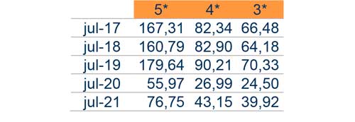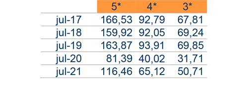 Los datos de ocupación y de rentabilidad medios en establecimientos hoteleros del mes de julio recogidos por el INE muestran cómo todavía no se han alcanzado los resultados medios obtenidos en 2019.