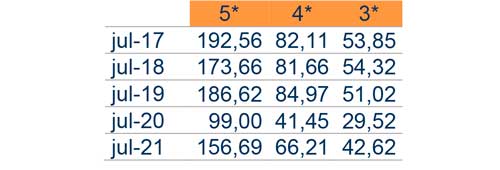 Desde Cehat destacan el descenso del 75% de las pernoctaciones de los turistas extranjeros en los últimos 12 meses, así como el 20% de las de los residentes en España. El mayor descenso se ha registrado en los hoteles de 3 estrellas, donde las pernoctaciones de turistas extranjeros han caído un 77% y las de residentes en España un 27%.