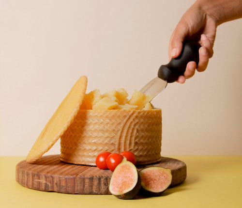 • La tradicional punta que se emplea para cortar los quesos italianos, es perfecta para partir un buen manchego curado en pequeñas porciones irregulares, dejando ver los estratos. El perfil aromático e intenso del queso se potencia con este tipo de corte.