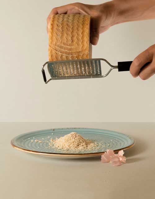• ¿Y por qué no usar un rallador? Este conocido utensilio de cocina se reinventa y se presenta como el accesorio idóneo para degustar una de las partes más sabrosas y de mayor concentración de sabor: la pleita, parte vertical marcada por un trenzado en la corteza. Un falso mito sostiene que la corteza del queso no se come: en el caso de Dehesa de los Llanos, con las condiciones higiénico-sanitarias en las que se curan los quesos, hace que los mohos naturales que colonizan la corteza, así como el cepillado exhaustivo con aceite de oliva virgen extra, pueden degustarse con total sabor y seguridad. La corteza concentra los sabores multiplicados por dos.