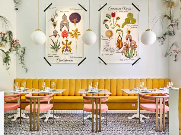 El primero goza de luz natural, mesas de mármol y unos vistosos sofás amarillos que contrastan con una pared llena de vegetación y flores expuestas en una selección de jarrones y recipientes de vidrio.