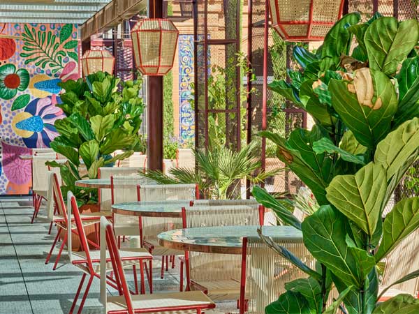 En la terraza, más contemporánea, triunfa lo exótico con multitud de plantas, trepadoras que cubren arcadas perfiladas con neones, murales entre lo aborigen y lo pop y el ladrillo rojo tan característico de Madrid.