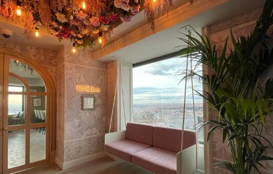 En la misma puerta del nuevo gastronbr los clientes encontrarán un nuevo punto de parada obligada: un romántico columpio que invita a los clientes a sentarse para tomarse una fotografía con las mejores vistas de Madrid de fondo.