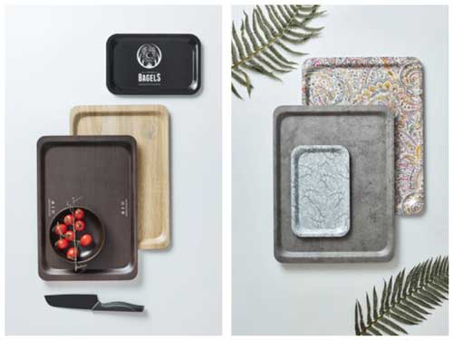 Son perfectas para servir alimentos en catering, bares y restaurantes, o como bandeja de room-service o amenities en el hotel. Se ofrecen en diferentes tamaños; lisas, en tonos clásicos, o decoradas, y se pueden personalizar con el logotipo, imagen de marca o cualquier motivo que el establecimiento prefiera: por ejemplo, los suelos de su local o el estampado de las paredes.