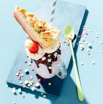• Cheesecake Happy Colour: ¡Nunca una tarta ha tenido colores más bonitos! Este colorista cheesecake de edición limitada atrae por la creativa superposición de ingredientes: dos cremosas capas de cheesecake descansan sobre una ligera base crumble. La combinación de queso con fresas y trocitos de fruta y dados de muffin se une a un colorido confeti, y por encima la fiesta continúa con hilos de chocolate blanco y confeti de azúcar aún más colorido como cobertura: