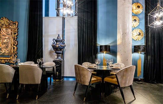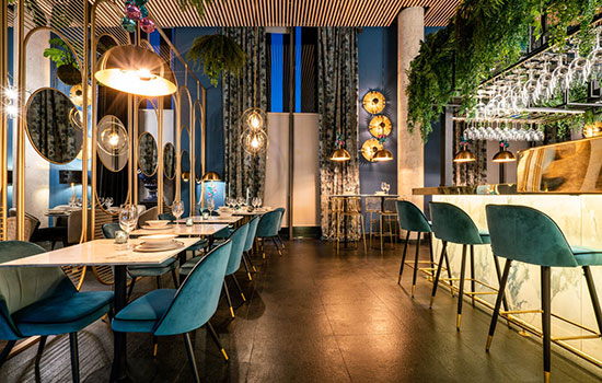 En las zonas donde están situadas las mesas altas o la barra, se juega con tonos más llamativos como el mostaza, azul marino y el dorado en la decoración, combinando diferentes texturas y materiales que aportan un toque de elegante sofisticación.
