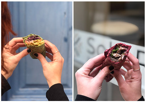 Otras especialidades de Sol y Roll son el Ajo Chicken, con pollo, salsa de ajo y encurtidos de pepino en pan de chía; el Red Sumac Chicken, de pollo, sumac, cebolla y pimiento en pan de remolacha; el Spicy Tofu, con tofu, pimienta dulce, salsa raita y pan de espinacas; o el Chorizo Confuso, con carne picada huevo, queso y encurtido de pepinos en pan de chía. Y, de postre, el Chocolawa, un roll preparado con halawa, chocolate negro, plátano y avellana en pan de chía.