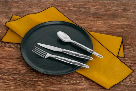 Por su parte, la serie Diamante de Lusini llama la atención por su vistoso relieve angular, diseño propio de Vega, y su forma ergonómica. Realizada en acero inoxidable 18/10, es apta para lavavajillas y ofrece 10 años de garantía de reposición.