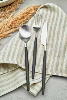 En cubertería, llegan modelos elegantes y ligeros como la nueva cubertería Turín, de acero inoxidable 18/10 con mangos negros de Pom (polioximetileno). Gracias a su fino diseño, se adapta bien a la mano y destaca en la mesa. Es un diseño propio de Vega.
