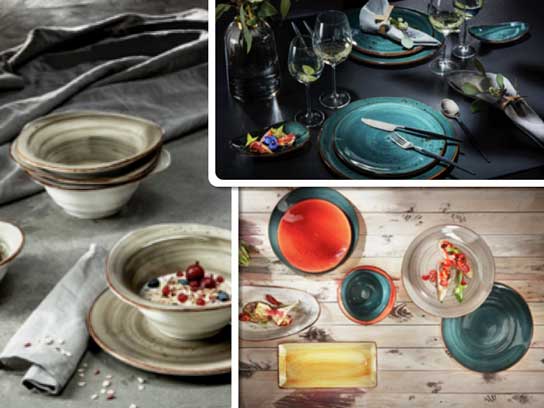 Por su parte, la nueva serie de porcelana premium Nebro gusta por sus colores modernos y su toque rústico al mismo tiempo. Se compone de platos llanos, fuentes, cuencos… todos únicos. Se ofrece en cuatro colores de plena moda, que combina perfectamente entre sí. Y por supuesto, es apta para el lavavajillas y microondas.