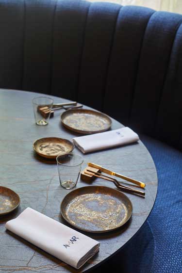 El acceso al restaurante se realiza mediante un espectacular túnel dorado flanqueado, en una de sus paredes, por vitrinas de joyería que mostrarán el producto con el que Rafa Zafra elabora sus recetas. Al otro lado de las vitrina se abre un espacio privado con capacidad para diez comensales.