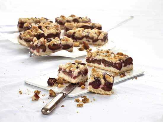 Porciones de la nueva Plancha de Ciruelas con Streusel, con una apariencia muy apetecible
