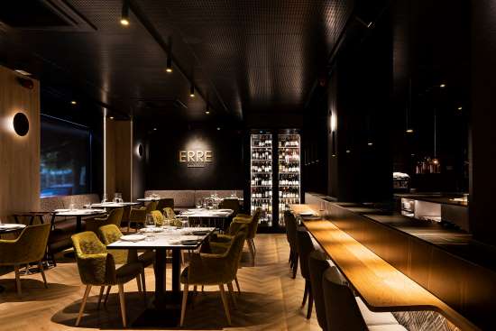 El interiorista Iñigo Egurrola ha diseñado para Erre de Roca un relajante espacio, sobrio y elegante, con una enorme cocina vista que parece una prolongación de la barra, donde el comensal también puede sentarse y disfrutar de platos y showcooking.