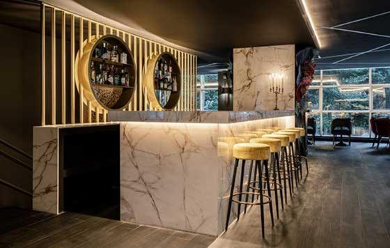 La barra, revestida en mármol, es el punto de luz del restaurante