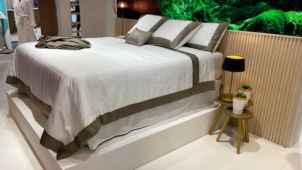 El elemento central del stand de Vayoil en Equiphotel ha sido una gran cama vestida con un juego de sábanas que pertenecen al catálogo de Vayoil para hoteles de lujo y que recoge las tendencias de 2023, año en el que los colores tenues serán los protagonistas.