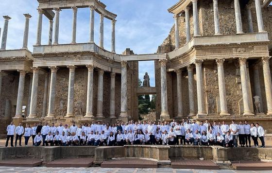 Participantes del VIII Certamen Nacional de Gastronomía junto a autoridades en el Teatro Romano de Mérida