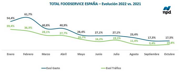 Según el estudio de NPD, la industria española de foodservice va a cerrar 2022 con un crecimiento de alrededor del 26% respecto al año pasado, hasta superar los 36.500 millones de euros, tan solo un 3% por debajo del negocio de 2019.