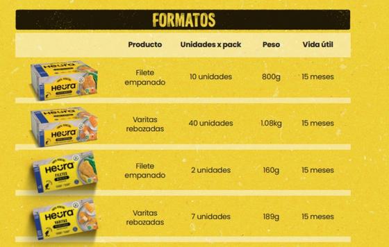 Por un lado, los Filetes empanados de merlvza están disponibles en pack de 10 unidades (800 gramos) y se pueden encontrar tanto refrigerados como congelados. Por su parte, las Varitas rebozadas vienen en pack de 40 unidades (1,08 kg) y se encuentran solo congeladas.
