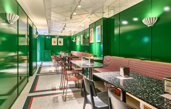 El verde intenso protagoniza la zona de mesas del nuevo Hermanos Vinagre, en la calle Cardenal Cisneros
