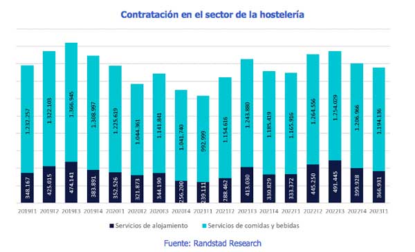 En el primer trimestre de 2023, el empleo en hostelería disminuyó en casi 46.000 personas respecto a los tres meses anteriores. Esta pérdida de empleo es más pronunciada en el alojamiento, con 33.000 puestos de trabajo, debido a la estacionalidad del segmento.