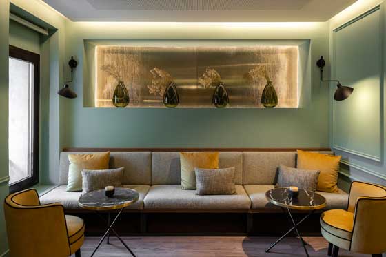Al igual que en el resto del hotel, el verde de la época es el predominante en las estancias. La madera se hace muy presente en el mobiliario y el estudio de la iluminación se ha basado principalmente en crear espacios marcados por el juego de luces.