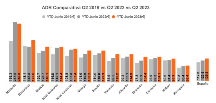 En el primer semestre de 2019, el ADR global en España fue de 112,8€ cuando este año ha sido de 135,8€, un 20% más. Todas las ciudades y destinos mejoran sus cifras respecto a ese año, logrando máximos históricos, señala el estudio.