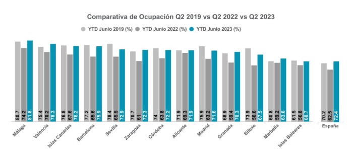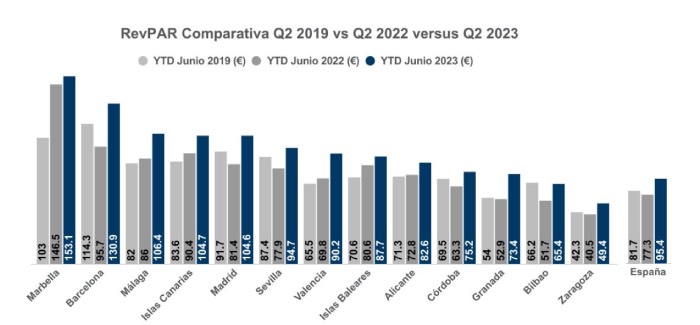 Esta recuperación se plasma en niveles de ocupación altos, del 70,2%, pesar de no ser la temporada más alta y, especialmente, en el nivel de precio medio (ADR) e ingresos por habitación disponible (Revpar) que mejoran los de 2022, pero también los de 2019, antes de la pandemia.