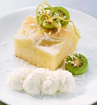 Más ideas Erlenbacher para un postre refrescante: la plancha de limón vegana de Erlenbacher (sabrosa crema de limón sobre una esponjosa base de muffin) siempre triunfa. Además de ser 100% vegetal, es deliciosa y fácil de manejar, y una base ideal para postres de fantasía, como esta «Creación vegana de limón«, especialmente rápida de preparar. combinando una porción de plancha con media rodaja de limón con mousse blanca, coco rallado y kiwi:
