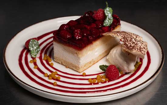 Profesionalhoerca, postre hecho con plancha de queso fresco y nata con frambuesas de Erlenbacher