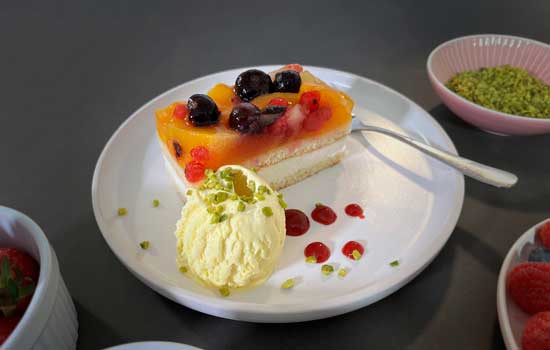 Esta tarta afrutada lleva el sabor del verano a cafeterías, restaurantes y pastelerías, y puede decorarse con diferentes acabados y guarniciones, como por ejemplo una bola de helado de vainilla, para una perfecta experiencia de postre, tentempié o merienda. Utilizando pistachos picados como guarnición, se logra un postre refrescante muy especial, con un atractivo juego de colores: