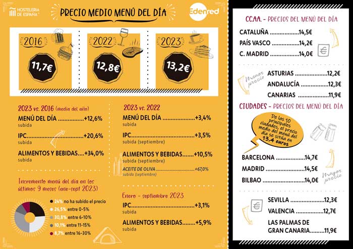 En cuanto a principales ciudades, el precio medio del menú del día se sitúa en 13,4 euros. Las ciudades con mayor precio medio del menú del día son Barcelona (14,7 euros), Madrid (14,5 euros) y Bilbao (14 euros), mientras que las ciudades con menor precio medio del menú del día son Sevilla (12,3 euros), Valencia (12,7 euros) y Las Palmas de Gran Canaria (11,9 euros)