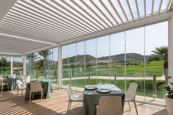 Profesionalhoreca, pérgolas bioclimáticas y cortinas de cristal Saxun en Font del Llop Golf Resort