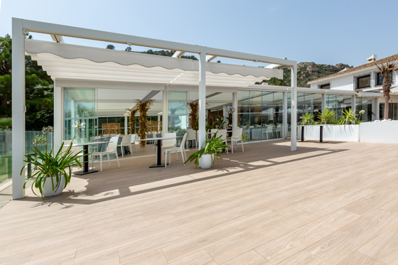 El conjunto de pérgolas está rodeado de cortinas de cristal correderas, que permiten una visibilidad total, para disfrutar del entorno mientras se come o cena. De este modo, con tan sólo abrir y cerrar las hojas de vidrio se le damos un uso diferente al restaurante, aumentado su versatilidad y funcionalidad.