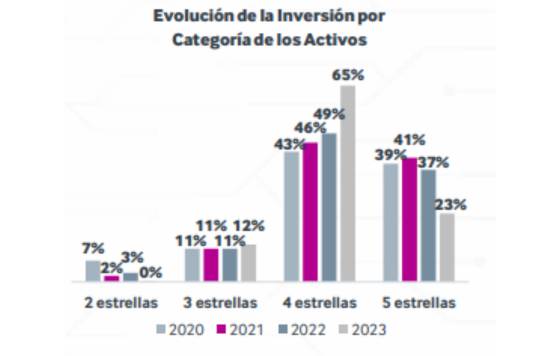 La categoría de cuatro estrellas se posicionó como la preferida entre los activos vendidos, atrayendo un 65% de la inversión total. Respecto al origen de la inversión, predomina el capital internacional, representando un 78% del total invertido en España en 2023. Este fenómeno se explica en gran medida porque que las principales carteras y activos individuales de mayor volumen fueron adquiridas por inversores internacionales.