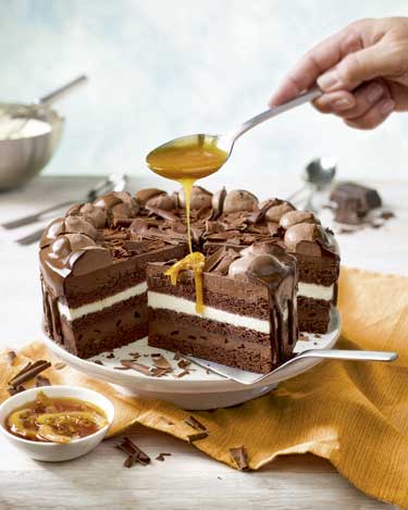 El Pastel Trueno de Chocolate es una tarta moderna sin cobertura (estilo naked cake), que permite ver el relleno a primera vista. Las llamativas cremas claras y de chocolate se alternan entra capas de brownie, y trocitos de chocolate añaden un toque de contraste. Para el toque final, se vierte chocolate puro por el borde: