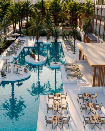 Piscina y terraza de hotel equipada con muebles Green Edition de la colección Sunset de Grosfillex